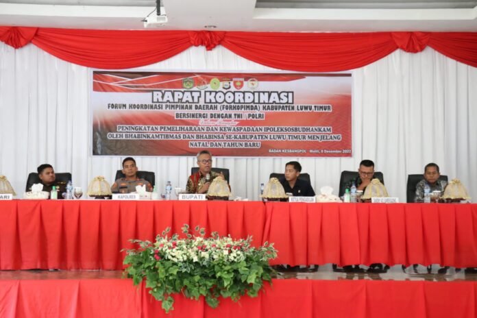 Luwu Timur, batarapos.com – Bupati Luwu Timur, H. Budiman didampingi Kapolres Luwu Timur, AKBP Silvester MM. Simamora membuka Rapat Koordinasi (Rakor) Forkopimda dalam rangka Peningkatan Pemeliharaan dan Kewaspadaan Ipoleksosbudhankam oleh Bhabinkamtibmas dan Bhabinsa se-Luwu Timur menjelang Natal dan Tahun Baru.