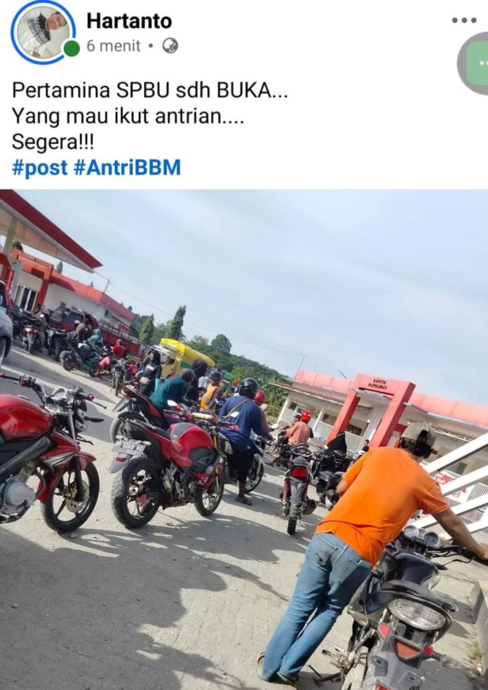 ” Pertamina SPBU sdh buka, yang mau ikut antrian, segera!!!,” tulis akun Facebook Hartanto di unggahannya.