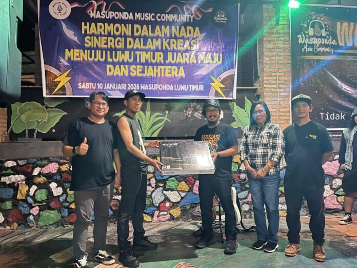 Luwu Timur, batarapos.com – Asosiasi Musisi Luwu Timur (AMLT) serahkan bantuan alat musik dari PT Vale Indonesia kepada Wasuponda Music Community (WMC) yang dilaksanakan di Bukit Makmur Tabarano, Sabtu (10/1/2026).