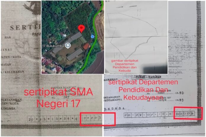 Bone, batarapos.com – Nomor sertipikat Departemen Pendidikan dan Kebudayaan Republik Indonesia, yang diterbitkan Bapadan Pertanahan Kabupaten Bulukumba, Sulawesi Selatan tahun 1993 silam, rupanya menunjuk  titik lokasi SMA Negeri 17 Bulukumba.