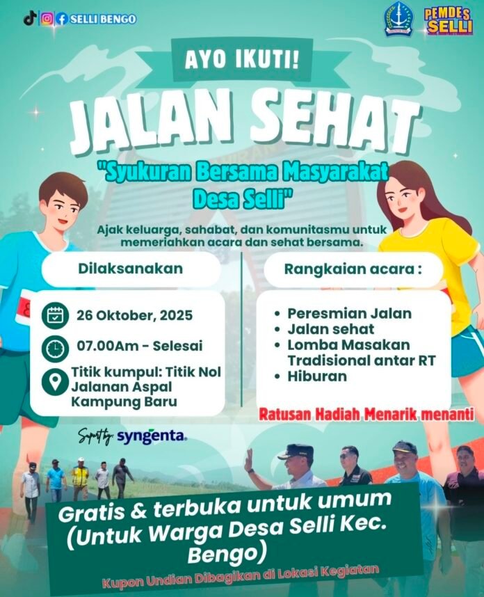 Bertemakan ” Syukuran masyarakat Desa Selli ” jalan sehat yang merupakan inisiatif masyarakat Desa Selli tersebut, dijadwalkan pada minggu pagi 26 Oktober 2025, selain itu, kegiatan ini rupanya juga mendapat Sponsorship oleh perusahaan bernama Syngenta, yang bakal memeriahkan jalan sehat di Desa Selli mendatang.