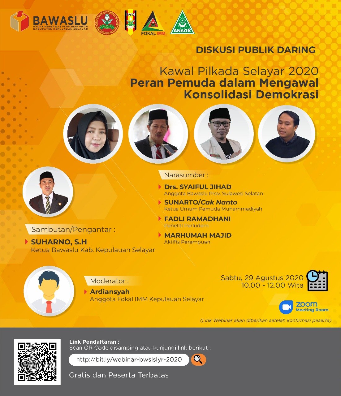 Diskusi publik daring yang akan diawali dengan sambutan pengantar, Ketua Badan Pengawas Pemilu (Bawaslu) Kabupaten Kepulauan Selayar, Suharno, SH, akan dipandu oleh anggota fokal IMM Selayar, Ardiansyah, selaku moderator diskusi.