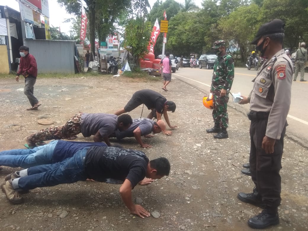 Dalam kegiatan ini dilakukan tindakan Pendisiplinan Warga yang tidak menggunakan masker berupa tindakan fisik berupa push up dan memungut sampah.(Mus).