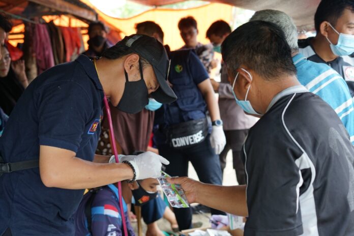 Nampak warga berdatangan dan antri untuk mendapat obat-obatan, diantaranya obat demam dan batuk untuk anak-anak serta multi vitamin bahkan minyak telon dan minyak kayu putih juga bagian dari aksi kemanusian kali ini. (Sbn)