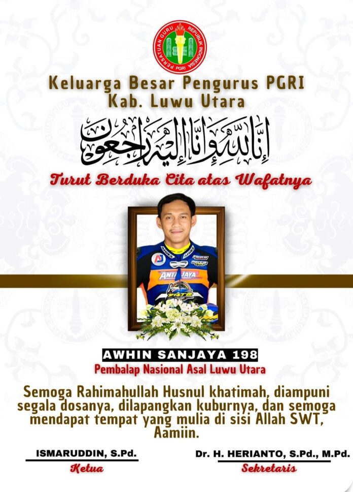 “Innalilahi wa innailaihi rojiun. PGRI Kabupaten Luwu Utara menyampaikan belasungkawa yang sedalam-dalamnya atas meninggalnya Nanda Awhin Sanjaya pembalap nasional asal Luwu Utara yang berprestasi.