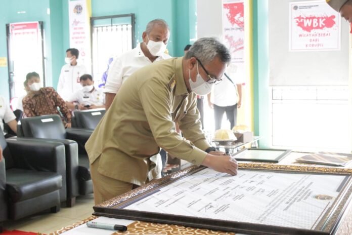 Luwu Timur, batarapos.com – Kantor Pertanahan Kabupaten Luwu Timur melakukan kegiatan pencanangan pembangunan zona integritas menuju Wilayah Bebas Korupsi (WBK) dan Wilayah Birokrasi Bersih Melayani (WBBM). Pencanangan zona integritas itu dihadiri langsung Bupati Luwu Timur, H. Budiman, di Gedung Wanita Simpurusiang Malili, Senin (4/10/2021).