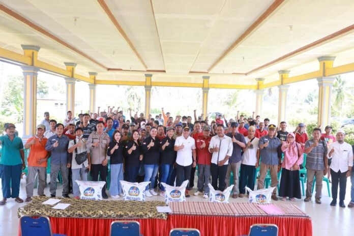 Luwu Timur, batarapos.com – Bupati Luwu Timur, H. Budiman didampingi Kepala Dinas Pertanian, Amrullah Rasyid serta Camat Wotu, Iskandar Muda, menyerahkan 10 Ton atau senilai 139.800.000 Rupiah bantuan pupuk NPK untuk 100 Hektar kebun kakao bagi lima Kelompok Tani di Tiga Kecamatan Wotu, Burau, dan Tomoni Timur, Sabtu (15/04/2023).