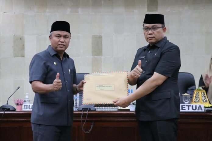 Usai menyampaikan sambutannya, Bupati Luwu Timur, H. Budiman menyerahkan Rancangan KUA dan PPAS TA. 2023 Kabupaten Luwu Timur kepada Ketua DPRD Luwu Timur, Aripin untuk dibahas dalam waktu yang tidak lama dan disetujui bersama sesuai dengan peraturan perundang-undangan.
