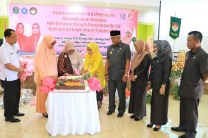 Puncak kegiatan peringatan Hari Ibu ke-91 dan HUT DWP ke-20 dilaksanakan dengan pemotongan kue tar oleh Ketua TP PKK Kabupaten Luwu Timur dan Ketua DWP Kabupaten Luwu Timur kemudian diberikan kepada Bupati Thoriq Husler dan Sekretaris Daerah Kabupaten Luwu Timur, Bahri Suli.