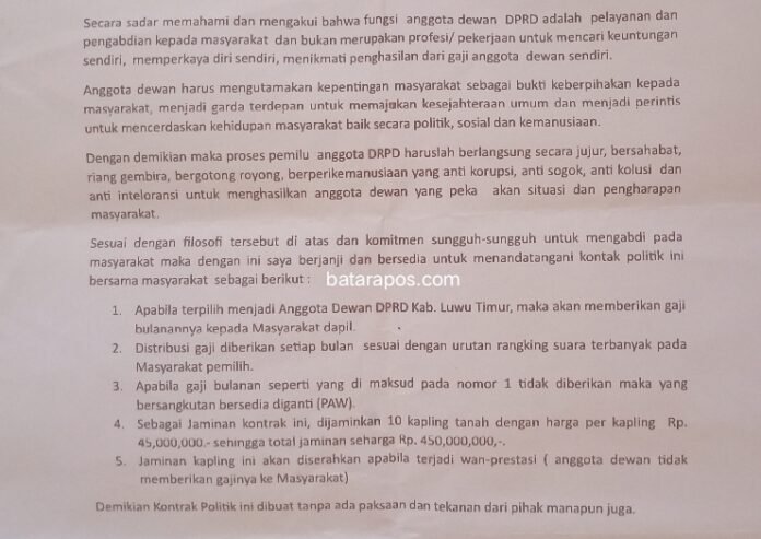 Menurutnya, janji tersebut dituangkan dalam kontrak politik sebagai bentuk pemenuhan aspirasi masyarakat yang sudah bosan dengan pengalaman janji-janji caleg dimasa lalu.
