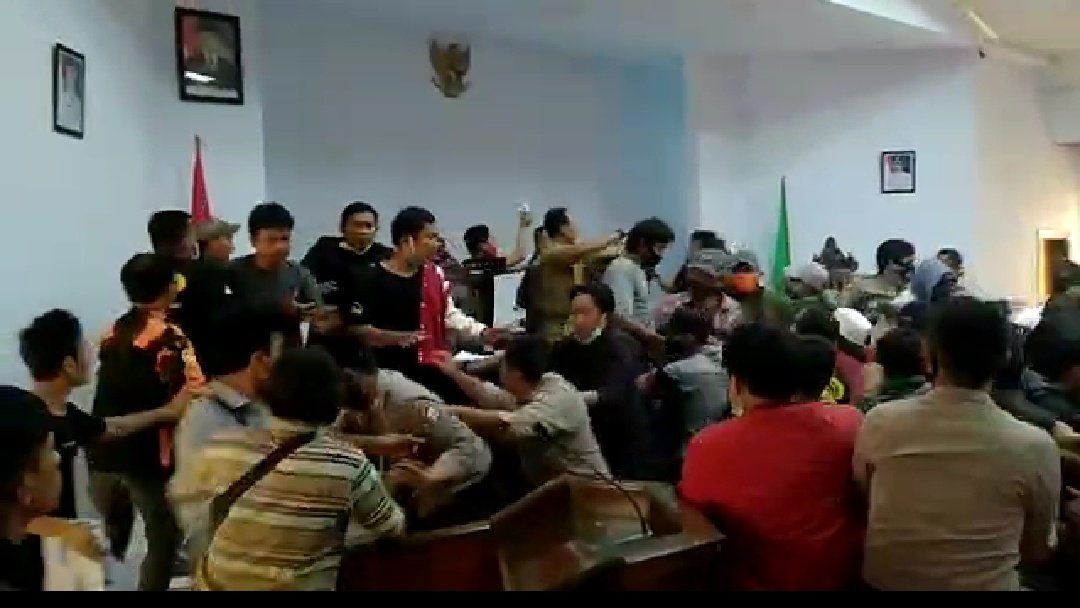Karena massa aksi tidak menemui Bupati, RDP tersebut berakhir ricuh, tampak sejumlah massa menyerang Anggota DPRD dalam ruang rapat. (**)
