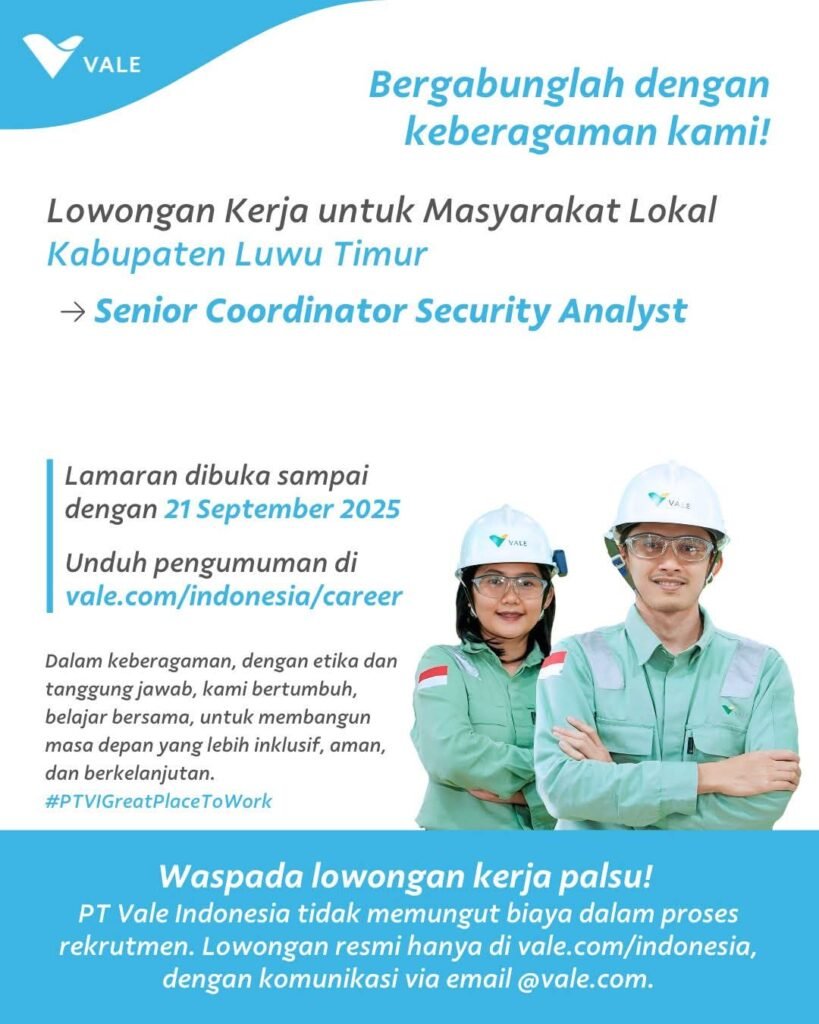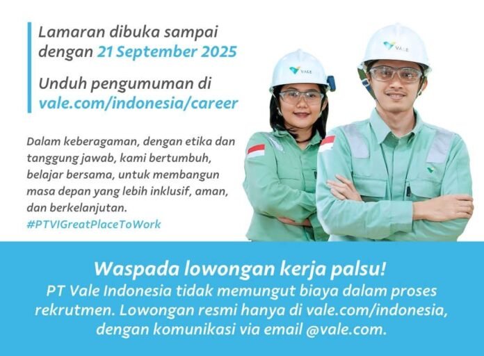 Luwu Timur, batarapos.com – PT Vale Indonesia kembali membuka lowongan kerja untuk masyarakat lokal Luwu Timur.