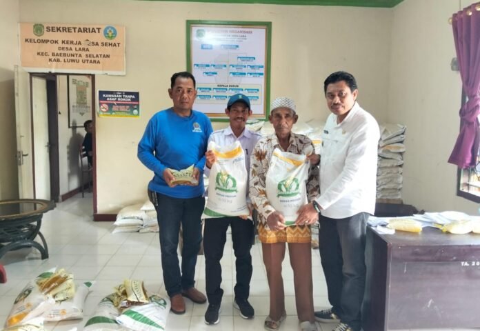 Luwu Utara, batarapos.com – Kepala desa (Kades) Lara, kecamatan Baebunta Selatan Risal Mubarak, menyerahkan bantuan pangan beras dan minyak goreng, kepada warga penerima, pada Rabu, (23/12/2025), di Aula Kantor desa Lara.