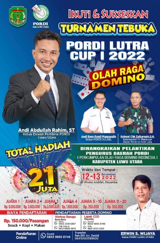 Luwu Utara, batarapos.com – Pengurus daerah Perkumpulan olahraga Domino Indonesia (PORDI) Kabupaten Luwu Utara akan menggelar turnamen PORDI Lutra Cup I 2022.