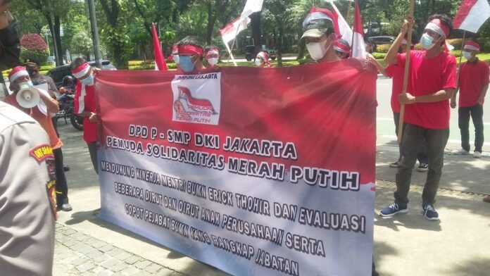 Jakarta,Ā batarapos.comĀ – Pemuda Solidaritas Merah Putih (P-SMP) menggelar aksi di depan kantor Kementerian BUMN Jl. Merdeka Selatan, Jakarta Pusat, Rabu (31/3/2021). Aksi ini mengusung tema mendukung Erick Thohir Menteri BUMN dan meminta jabatan ganda atau rangkap jabatan di BUMN dicopot.