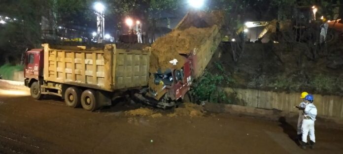 Akibatnya truck yang sedang muat tanah ore itu tergelincir kebawah dan menabrak truck lainnya yang berada di jalan.