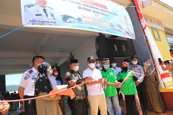 Luwu Timur, batarapos.com – Terminal Angkutan Darat Malili resmi pindah di Kawasan Pusat Niaga, Desa Puncak Indah, Kecamatan Malili. Peresmian pengoperasian terminal tersebut ditandai pengguntingan pita oleh Bupati Luwu Timur, H. Budiman, yang didampingi Kadis Perhubungan, Andi Makkaraka, Rabu (18/8/21).