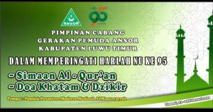 Luwu Timur, batarapos.com – HARLAH NU ke-95 Tahun dirayakan oleh GP.Ansor Se-Sulawesi Selatan dengan melakukan Simaan Al-Qur’an, zikir dan doa bersama selama dua hari, di pondok pesantren masing-masing Kabupaten kota dengan melibatkan pengasuh pondok pesantren dan santri.