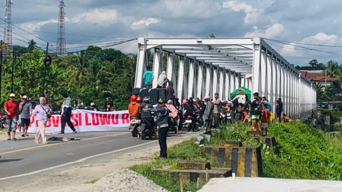 Luwu Utara, batarapos.com – Arus lalu lintas di jalan poros Palopo–Masamba mengalami kemacetan total akibat aksi demonstrasi Aliansi Mahasiswa yang menuntut pemekaran Provinsi Luwu Raya, Senin (12/01/2026). Aksi berlangsung di ujung Jembatan Sabang, Kecamatan Sabbang, Kabupaten Luwu Utara.