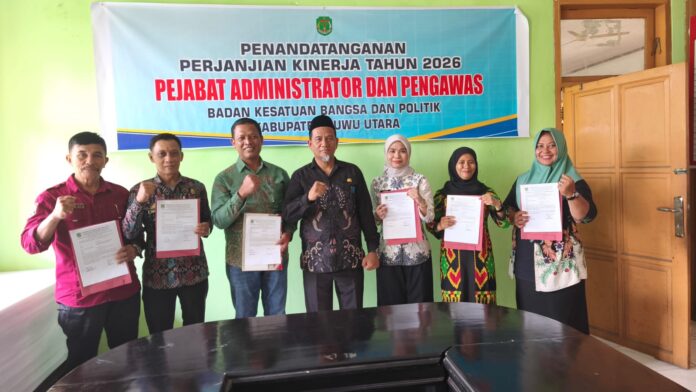 Luwu Utara, batarapos.com – Kepala Badan Kesatuan Bangsa dan Politik (Kaban Kesbangpol) Kabupaten Luwu Utara menggelar penandatanganan perjanjian kinerja antara Kuasa Pengguna Anggaran (KPA) dengan Pejabat Pengelola Keuangan (PPK) serta Pejabat Pelaksana Teknis Kegiatan (PPTK), Kamis (2/4/2026).