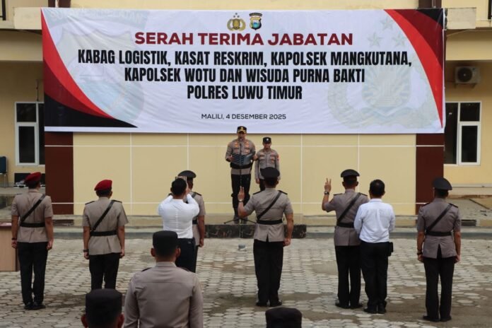 Sertijab dan Wisuda Purna Bakti Personel Polres Luwu Timur ini berlangsung di lapangan apel Mako Polres Luwu Timur yang baru, Kamis 04 Desember 2025.