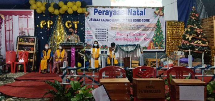 Luwu Timur, batarapos.com – Kapolsek Burau, AKP Martinus Wembem menghadiri perayaan Natal Persekutuan pemuda gereja Toraja ( PPGT) jemaat Lauwo Baru,Desa Lauwo kecamatan Burau, Jumat (31/12/2021) malam.