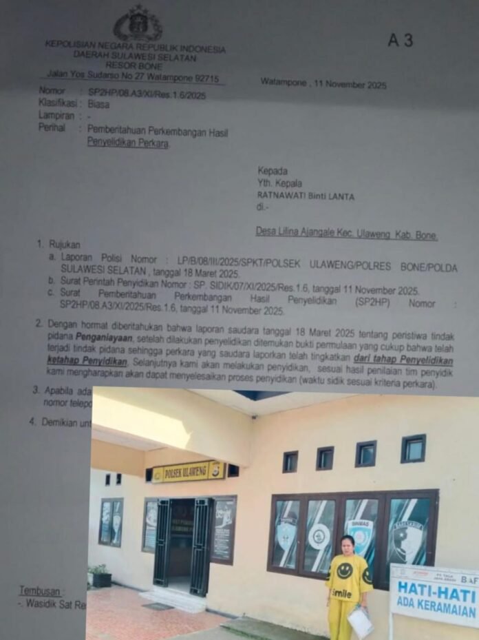 Pasalnya laporan yang dilayangkan korban sebelumnya berdasarkan bukti Laporan Polisi Nomor: LP/B/08/III/2025/SPKT/Polsek Ulaweng/Polres Bone /Polda Sulsel akhirnya ditingkatkan ketahap penyidikan.
