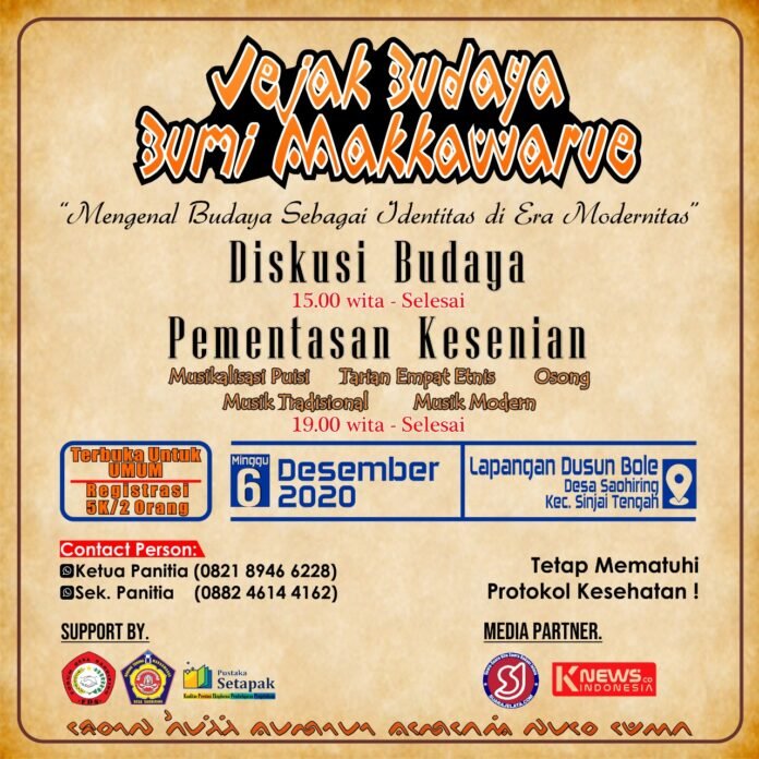 Sinjai, batarapos.com – Forum Desa Saohiring (FDS) akan menggelar kegiatan Jejak Budaya Bumi Makkawarue pada tanggal 6 Desember 2020 yang diselenggarakan di Lapangan Dusun Bole, Desa Saohiring, Kecamatan Sinjai Tengah, Kabupaten Sinjai.
