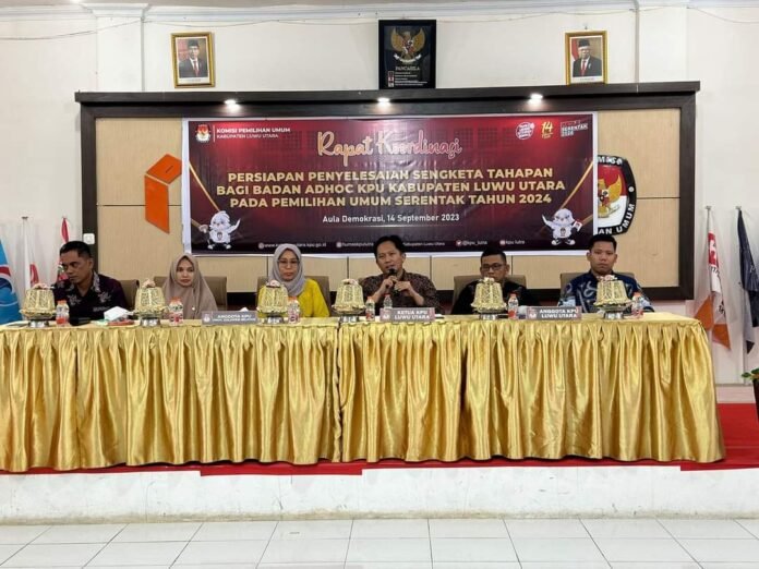 Luwu Utara, batarapos.com – Komisi Pemilihan Umum (KPU) Kabupaten Luwu Utara (Lutra) menggelar rapat koordinasi (Rakor) persiapan penyelesaian sengketa tahapan pada pemilihan umum (Pemilu) tahun 2024, di Aula Demokrasi, Kamis (14/09/2023).