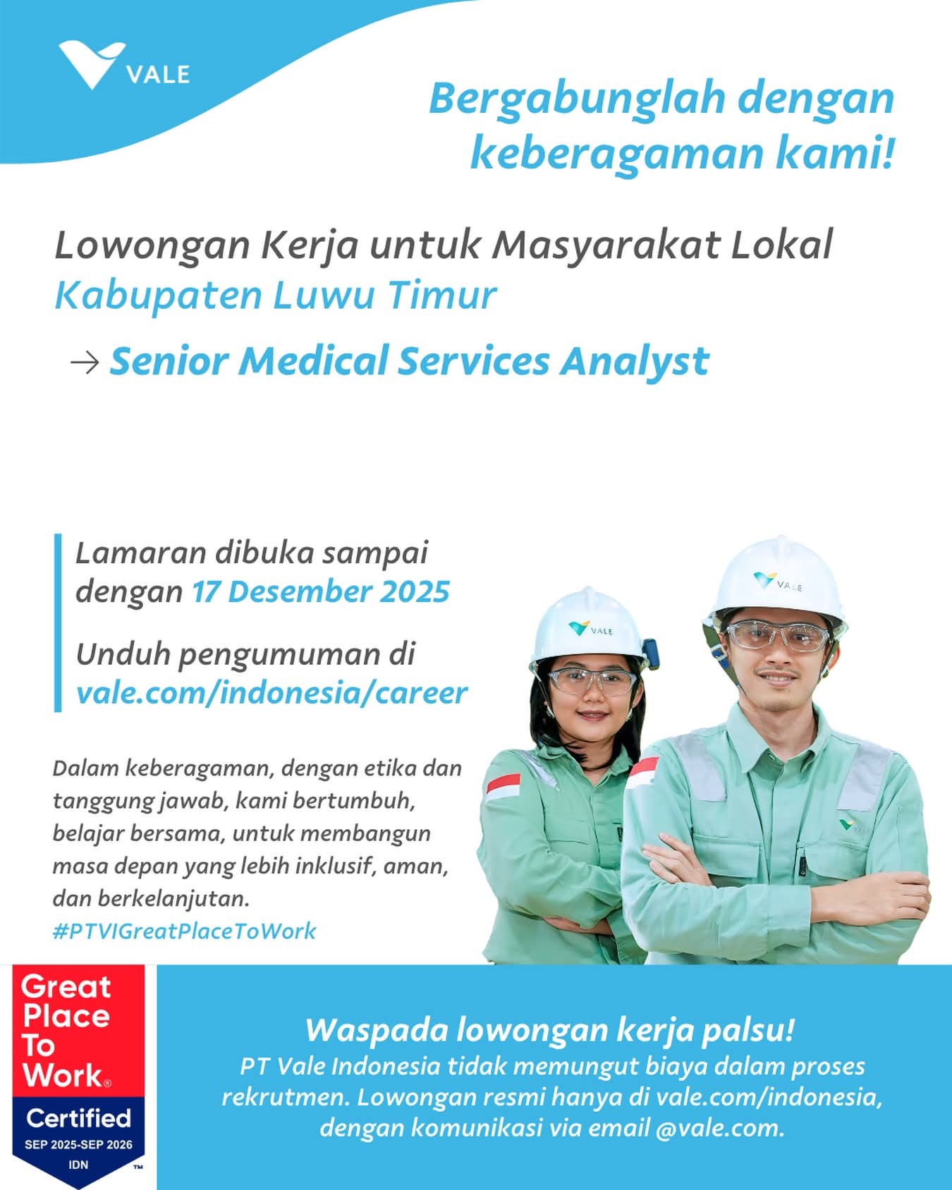 Kirimkan segera berkas lamaran sebelum 17 Desember 2025, atau anda dapat mengunduh pengumuman lengkap di vale.com/indonesia/career.