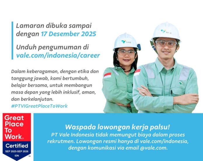 Dalam proses rekrutmen PT Vale tidak memungut biaya dan hanya diumumkan melalui situs serta media sosial resmi PT Vale Indonesia.