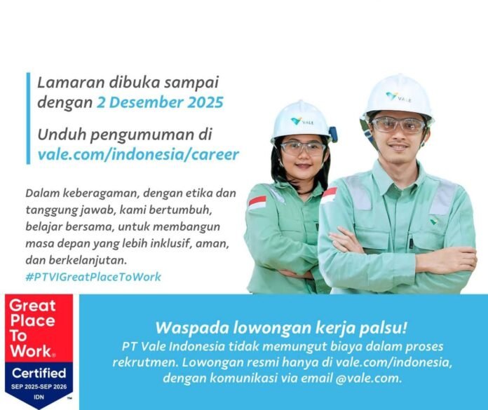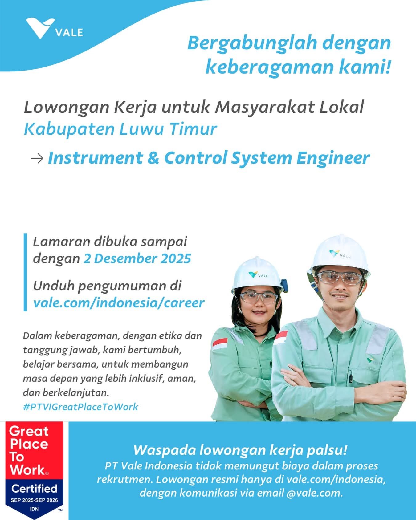 Kirimkan segara berkas lamaran Anda sebelum 2 Desember 2025, atau anda dapat mengunduh pengumuman lengkap di: vale.com/indonesia/career.