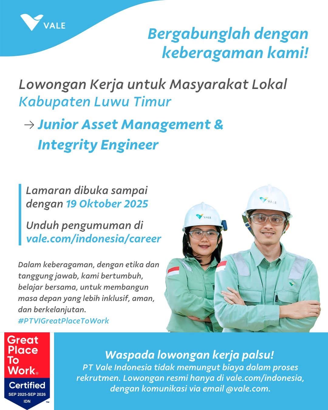 PT Vale mengundang talenta terbaik Kabupaten Luwu Timur untuk bergabung pada posisi Junior Asset Management dan Integrity Engineer.