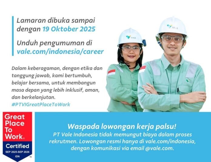 Bagi anda yang berminat, dapat mengirim berkas lamaran sebelum 19 Oktober 2025, atau mengunduh pengumuman lengkap di: vale.com/indonesia/career.