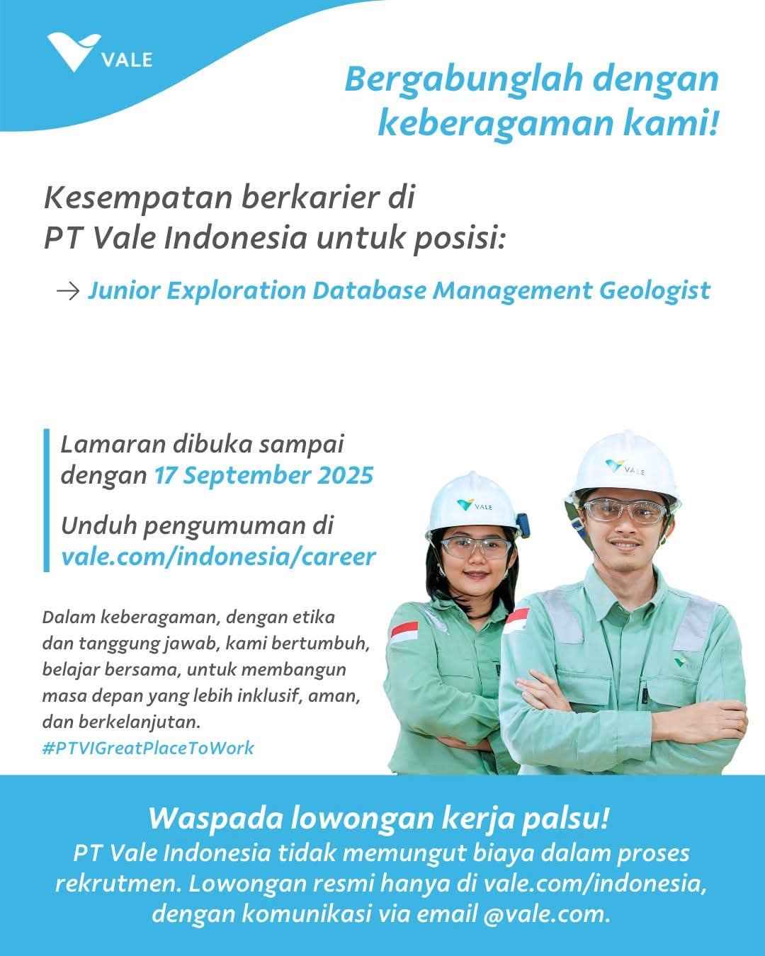 Informasi lengkap mengenai lowongan ini dapat diakses melalui situs resmi PT Vale Indonesia .