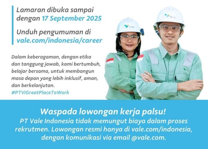 PT Vale Indonesia mengimbau masyarakat untuk berhati-hati terhadap penipuan dan menegaskan bahwa proses rekrutmen tidak dipungut biaya apapun.