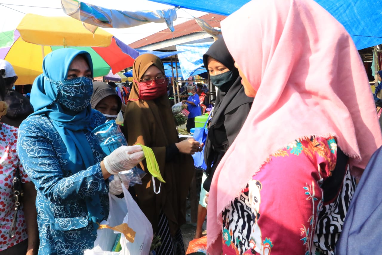 TP PKK bersama DWP menyasar pengunjung dan pedagang yang berjualan di Pasar Kalaena, Desa Kalaena Kiri Kecamatan Kalaena, Rabu (22/4/2020). Pembagian masker tersebut merupakan yang keempat kalinya setelah sebelumnya beberapa hari lalu juga dilakukan dibeberapa titik lokasi yang berbeda.