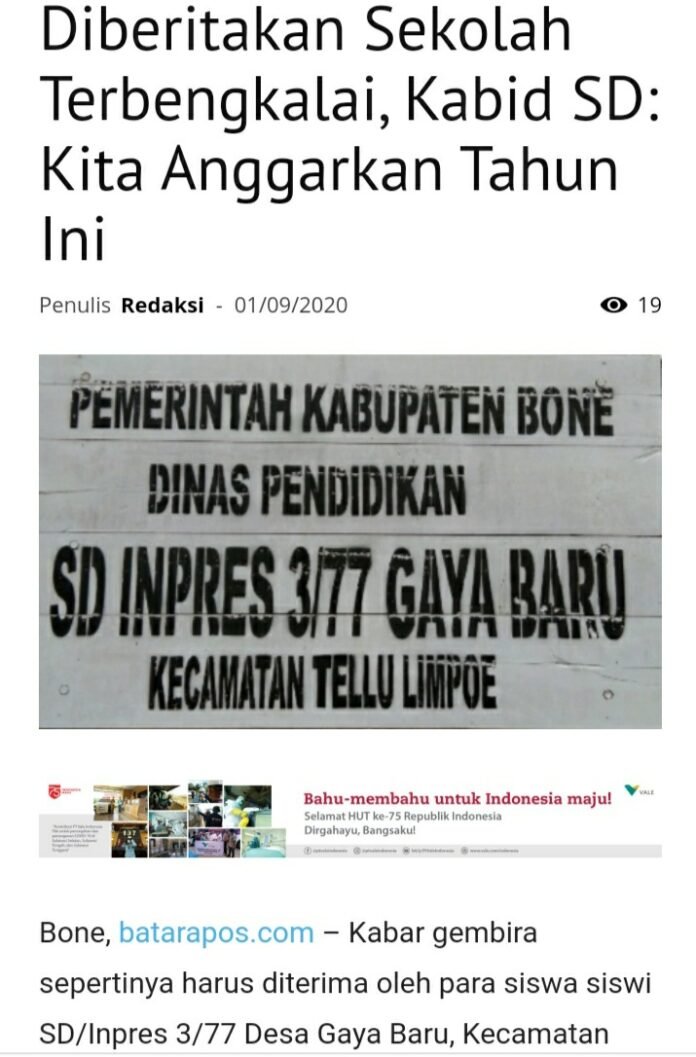 Bone, batarapos.comĀ – Terkait pemberitaan sebelumnya yang diberitakan melalui media ini tepatnya hari Selasa 01 September 2020 dengan judul “Gedung Sekolah Dasar Tellu Limpoe Terbengkalai, Tenaga Pengajar Hanya Satu”, yang kemudian ditanggapi oleh Kepala Bidang SD/MI Dinas Kabupaten Bone Drs. Budiman M.Pd.