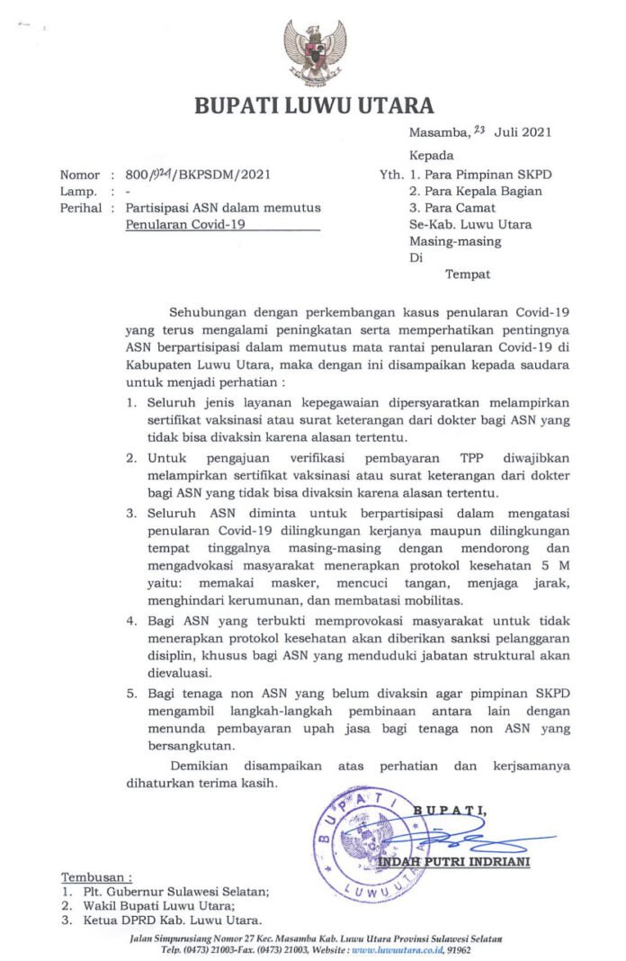 Pemda Luwu Utara Keluarkan Surat Perihal Partisipasi ASN Putus Penularan Covid-19, Ini 5 Butir Partisipasinya !
