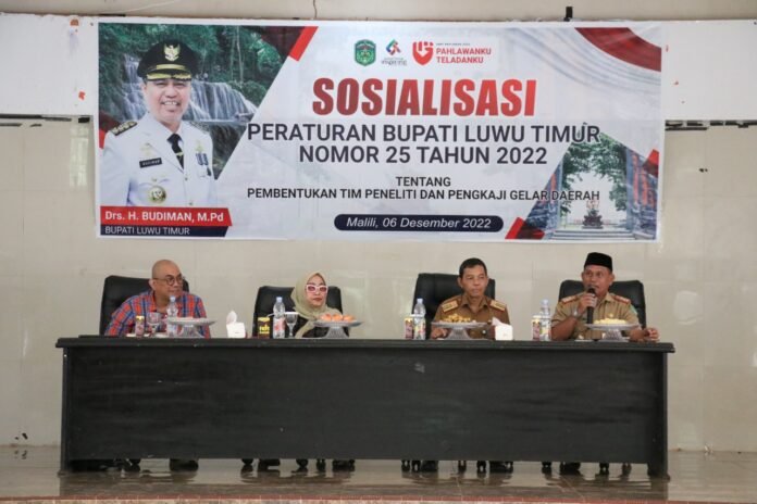 Luwu Timur, batarapos.com – Pemerintah Kabupaten Luwu Timur melalui Dinas Sosial Pemberdayaan Perempuan dan Perlindungan Anak (Dinsos P3A) menggelar Sosialisasi Peraturan Bupati (Perbup) Luwu Timur Nomor 25 Tahun 2022 tentang Pembentukan Tim Peneliti dan Pengkaji Gelar Daerah (TP2GD), di Gedung Wanita Simpurusiang Malili, Selasa (6/12/2022).