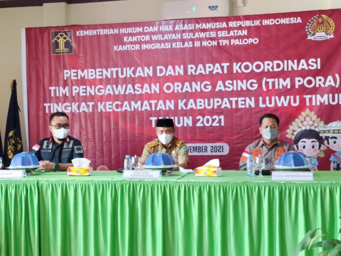 Oleh karena itu, Kantor Imigrasi Kelas III Non TPI Palopo, Selasa (9/11/2021), bertempat di Hotel Lagaligo Malili, menyelenggarakan Rapat Koordinasi dan Pembentukan Tim Pengawasan Orang Asing (TIMPORA) Tingkat Kecamatan wilayah Kabupaten Luwu Timur Tahun 2021.
