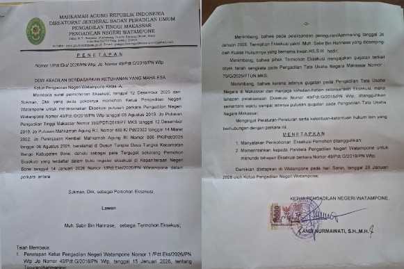 Surat penangguhan permohonan eksekusi Sibu Bin Juma berdasarkan penetapan Ketua Pengadilan Negeri Bone yang diteken Andi Nurmawati, S. H., M. H pertanggal 26 Januari 2026 dan baru diterima pemohon pada selasa 21 April 2026 sekitar jam 9 pagi melalui jasa pengiriman PT. Pos Indonesia