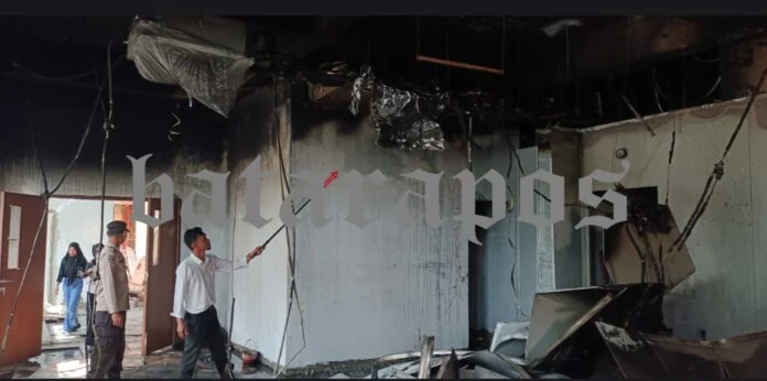 Gedung yang tengah berlangsung proyek rehab ini terbakar dibagian plapon, sementara gedung ini belum berfungsi instalasi listrik atau belum dialiri listrik.