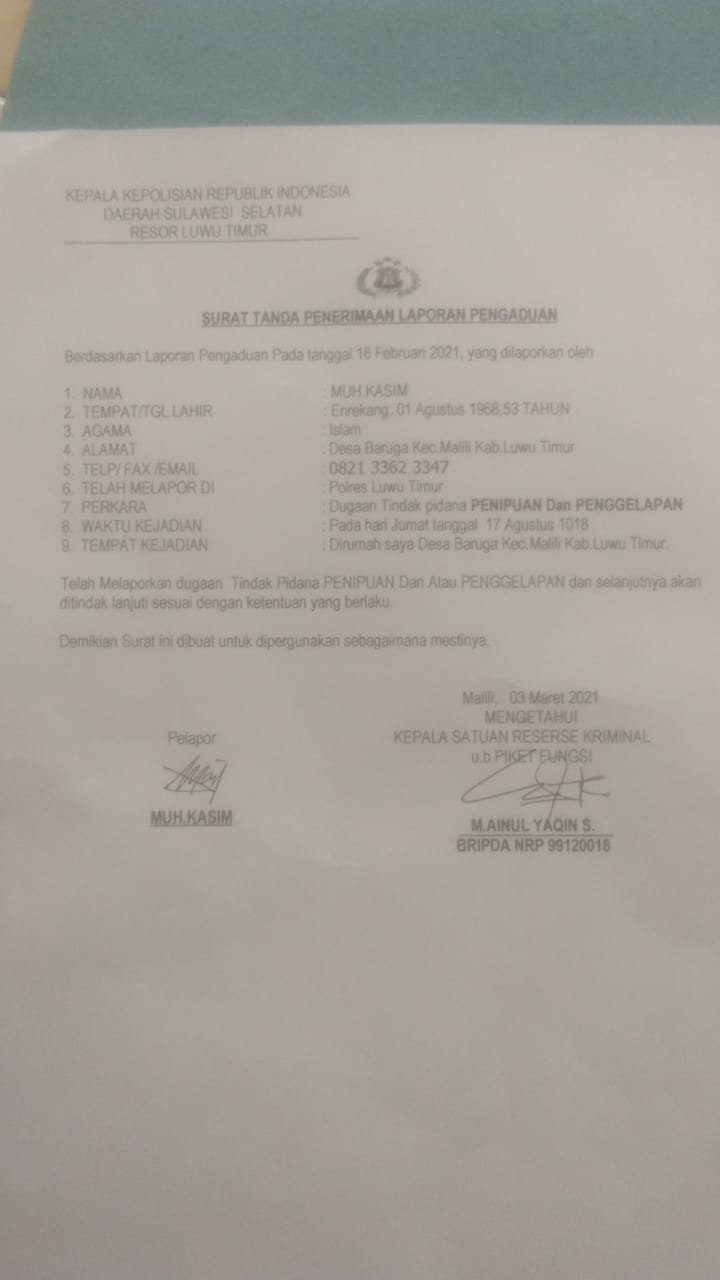 Diketahui kejadian penipuan tersebut terjadi pada tanggal 17 Agustus 2018 dan korban Kasim melapor ke Polres Luwu Timur pada Rabu (3/3/2021). (Sbn)