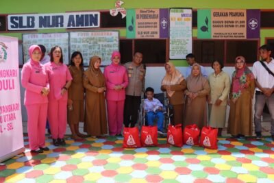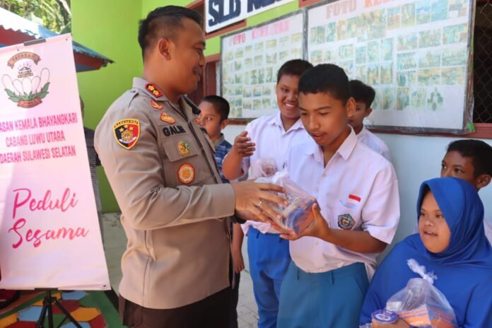 Luwu Utara, batarapos.com – Kapolres Luwu Utara AKBP Galih Indragiri, S.I.K didampingi Ketua Bhayangkari Cabang Luwu Utara Ny. Ingrid Galih melaksanakan kunjungan dan berikan bantuan sosial berupa Sembako, dan Bingkisan Makanan di SLB (Sekolah Luar Biasa) Nur Amin Kelurahan Bone, Kecamatan Masamba, Selasa (6/12/2022).
