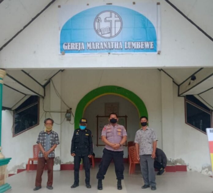 Ditengah wabah covid-19 personil Polsek burau Polres Luwu timur tetap melaksanakan pengamanan di tempat-tempat ibadah salah satunya gereja GKST Lumbewe yang terletak di desa lumbewe kecamatan burau, kabupaten luwu timur.