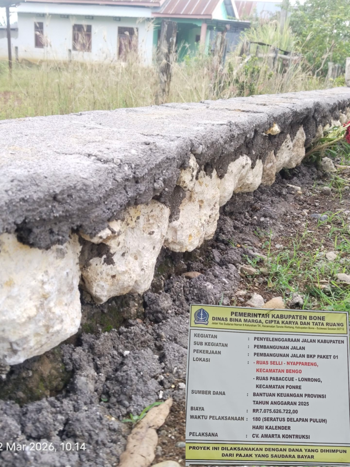 Hasil pantauan batarapos.com di lokasi proyek pekerjaan pembangunan jalan BKP paket 01, bersumber dari dana bantuan keuangan provinsi tahun anggaran 2025, melalui Pemerintah Kabupaten Bone Dinas Bina Marga, Cipta Karya dan Tata Ruang selaku pengguna anggaran memperlihatkan pekerjaan yang terkesan buruk rupa.