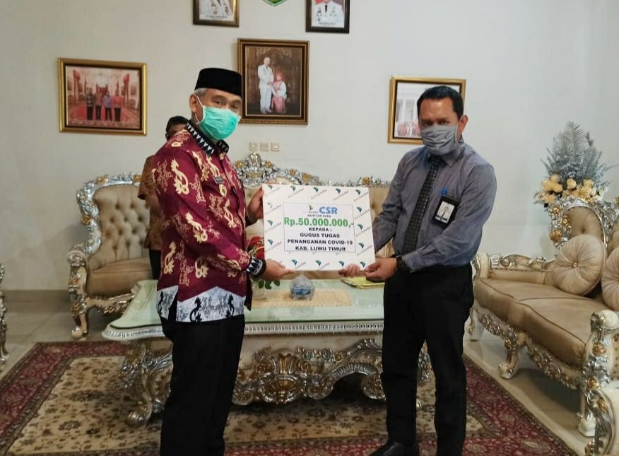 Luwu Timur, batarapos.com – Sebagai bentuk keprihatinan dan dukungan atas musibah wabah virus corona atau Covid-19, PT. Bank Sulselbar menyerahkan donasi kepada Pemerintah Kabupaten Luwu Timur dalam hal ini Tim Gugus Tugas Penanganan Covid-19 Kabupaten Luwu Timur senilai Rp. 50 Juta Rupiah.