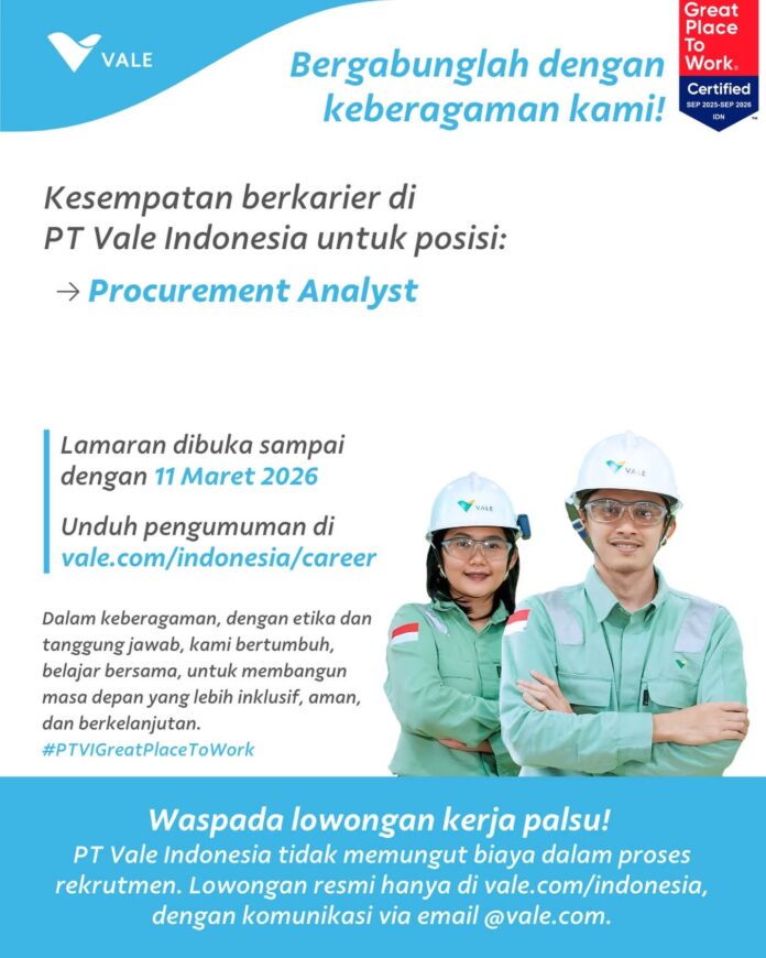 PT Vale Indonesia membuka lowongan kerja untuk posisi Procurement Analyst.
