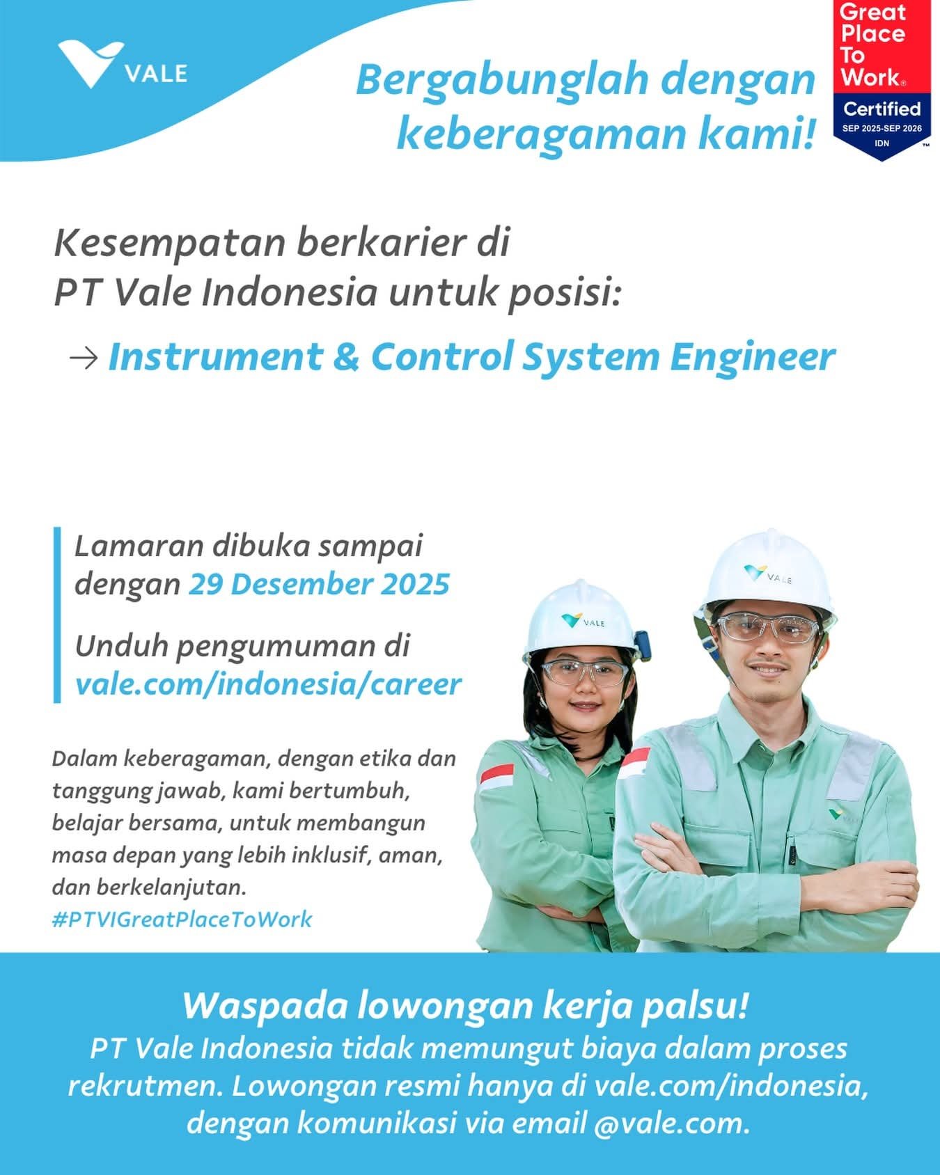 Jika berminat, kirimkan segera berkas lamaran anda sebelum 29 Desember 2025, atau dapat mengunduh pengumuman lengkap di: vale.com/indonesia/career